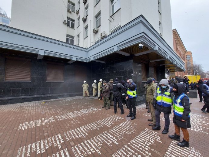 Потім будівлю Офісу генпрокурора закидали фаєрами.Поліція не втручається, на місці працюють пожежники.