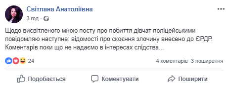 "Щодо освітленого мною поста про побиття дівчат поліцейськими повідомляю наступне: відомості про вчинення злочину внесені до Єдиного реєстру. Коментарів поки не надаємо в інтересах слідства..." - прокоментувала Оснач. За даними видання "Факти", серед побитих були дві вагітні жінки. У одної з них - загроза викидня, другу направили до нейрохірурга. Існують дві версії події. За однією, п'яні поліцейські після застілля вирішили розважитися сексом. Біля метро "Політехнічний інститут" вони знайшли чотирьох дівчат, завели їх до службового приміщення в будівлю метрополітену і там намагалися силою схилити до інтиму.