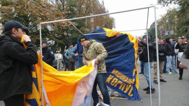 Наразі на місці проведення акції, на самому початку вулиці Банкової, вже встановлено автомобіль з гучномовцями. Безпосередньо на проїжджій частині Інститутської вже стоїть один намет агітаційного типу «Національного корпусу».