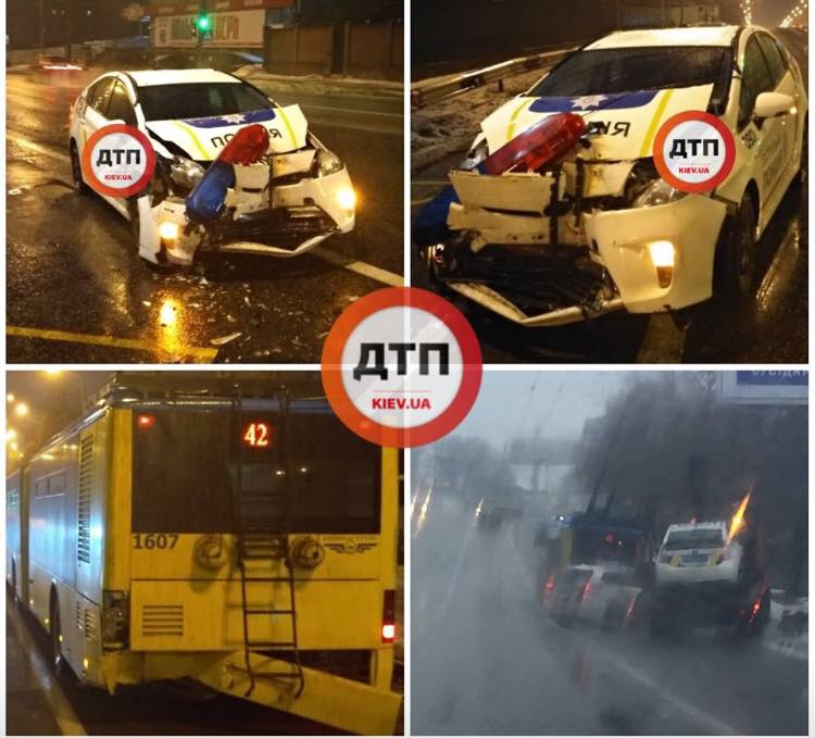 Перша нічна ДТП за участю поліцейського патрульного Toyota Prius в Києві трапилась на проспекті Лобановського: на порожній нічній дорозі водій автомобіля не впорався з керуванням і на повному ходу влетів у тролейбус 42-го маршруту, який їхав в депо.В результаті сильного удару передня частина патрульного автомобіля повністю зім’ялась, злетів проблисковий маячок.