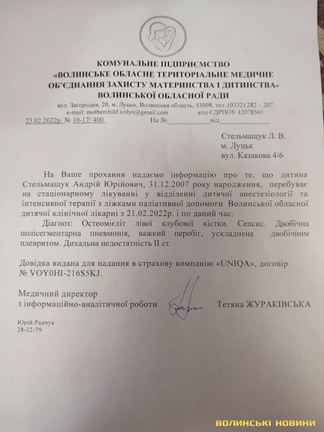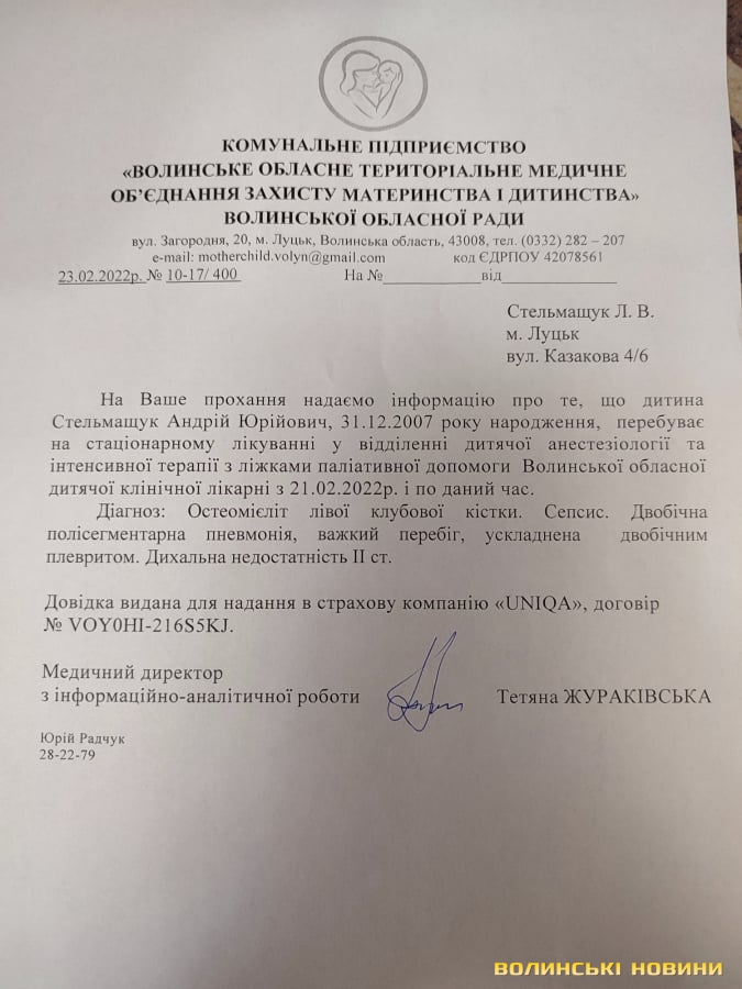 З 21 лютого і до сьогодні Андрій перебуває на лікуванні у відділенні дитячої анестезіології та інтенсивної терапії з ліжками для паліативної допомоги. Діагноз: остеоміеліт лівої клубової кістки, сепсис, двобічна полісегментарна пневмонія, важкий перебіг. Ускладнена двобічним плевритом. Дихальна недостатність 2 ступеня.«Потрібна допомога! Велика біда прийшла в нашу сім'ю. Мій брат, 14-річний Андрій, в реанімації у важкому стані. Хлопець підключений до кисневого апарату, бо не може самостійно дихати через септичну пневмонію. Внутрішні органи не справляються зі своїми функціями через сепсис і остеомієліт. Хлопець потребує дороговартісного лікування. Просимо допомогти коштами і молитвами», - благає небайдужих чоловік.