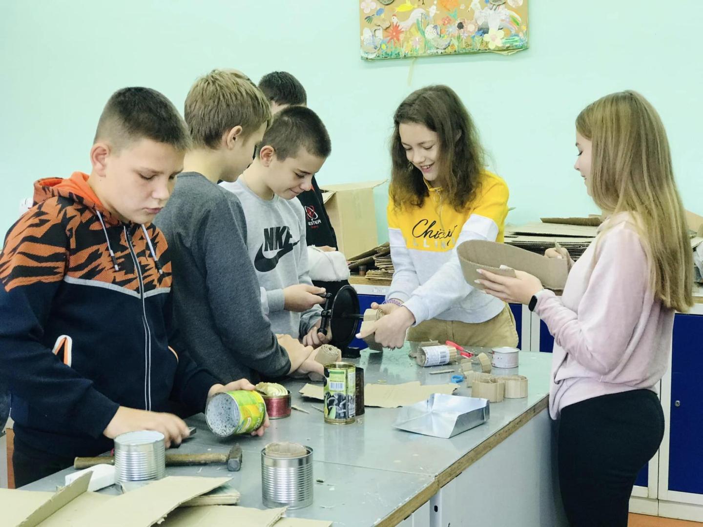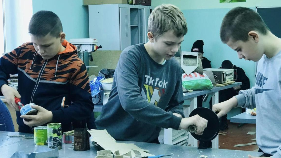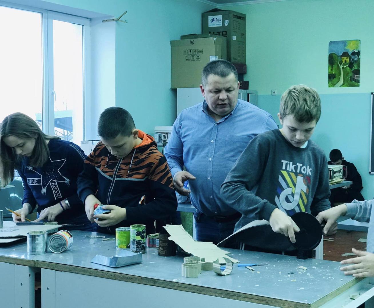 Школярі разом з педагогом Андрієм Никоньчуком майструють вироби на уроках трудового навчання і передають місцевим волонтерам, аби ті доставили на передову.