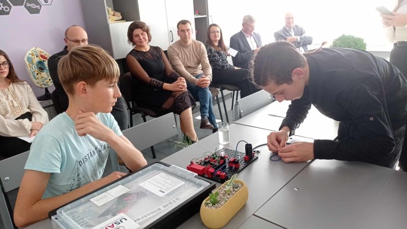 Тож під час заходу вчителі разом з учнями презентували роботу нового обладнання, демонстрували, як використовують його на своїх уроках, ознайомили присутніх із цікавими дослідженнями з біології, хімії та фізики.Серед оснащення – механічні 3D таймери, 3D ручки з витратними матеріалами, блоки живлення з контролерами, конструктори, акумулятор, цифрові лабораторії для хімії та біології, цифровий мікроскоп, комплект моделей атомів для складання молекул, пристрій для демонстрації збереження імпульсу, прилад для демонстрації спектру магнітного поля постійного магніту, базовий демонстраційний набір та інше.