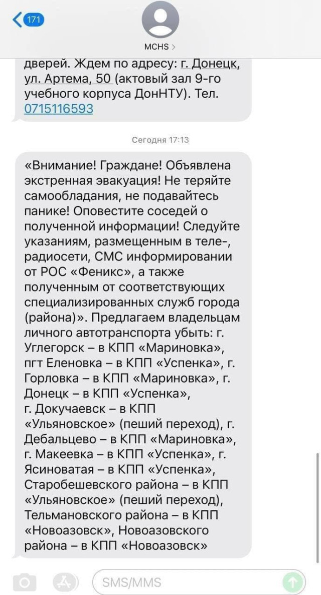 Андрій Лустенко закликав усіх колег, дітей їхніх батьків зберігати спокій.А ось такі СМС отримують абоненти донецького мобільного оператора «Фенікс», який працює на непідконтрольній території.Раніше Денис Пушилін оголосив про масову евакуацію населення до Росії з «ДНР» у зв’язку з тим, що найближчим часом, за його твердженням, Зеленський дасть наказ про наступ сил ЗСУ на Донбасі. Слідом за головою Донецька аналогічна заява прозвучала і від «глави ЛНР» Леоніда Пасічника, який закликав мешканців у найкоротші терміни виїхати на територію Росії. Він також заявив про підготовку наступу ЗСУ та закликав чоловіків, готових взяти зброю, захищати «республіку».