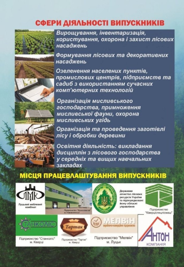 Випускників обіцяють працевлаштувати у провідні волинські підприємства: Луцький меблевий комбінат, "Кроноспан" (Нововолинськ), "Мелвін" (Луцьк), "Станколіс" (Ківерці), "Тартак" (Ківерці) та інші."У нас є укладені договори про співпрацю з провідними вищими навчальними закладами і виробничими підприємствами, зокрема й державними установами, такими як Волинське обласне управління лісового мисливського господарства. Наші студенти там проходять практику. Також ми співпрацюємо з деревообробними підприємствами, приватними підприємствами. З технічними університетами Львова, Харкова, Києва", – розповів Микола Толстушко."Зараз проблема інша: просять на роботу людей. Треба знайти людей, які хочуть працювати. Мабуть, когось не задовольняє заробітна плата, може, хтось хоче більшого кар'єрного росту, а хтось відкриває свій маленький бізнес", – каже він.
