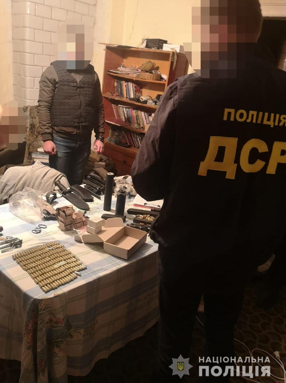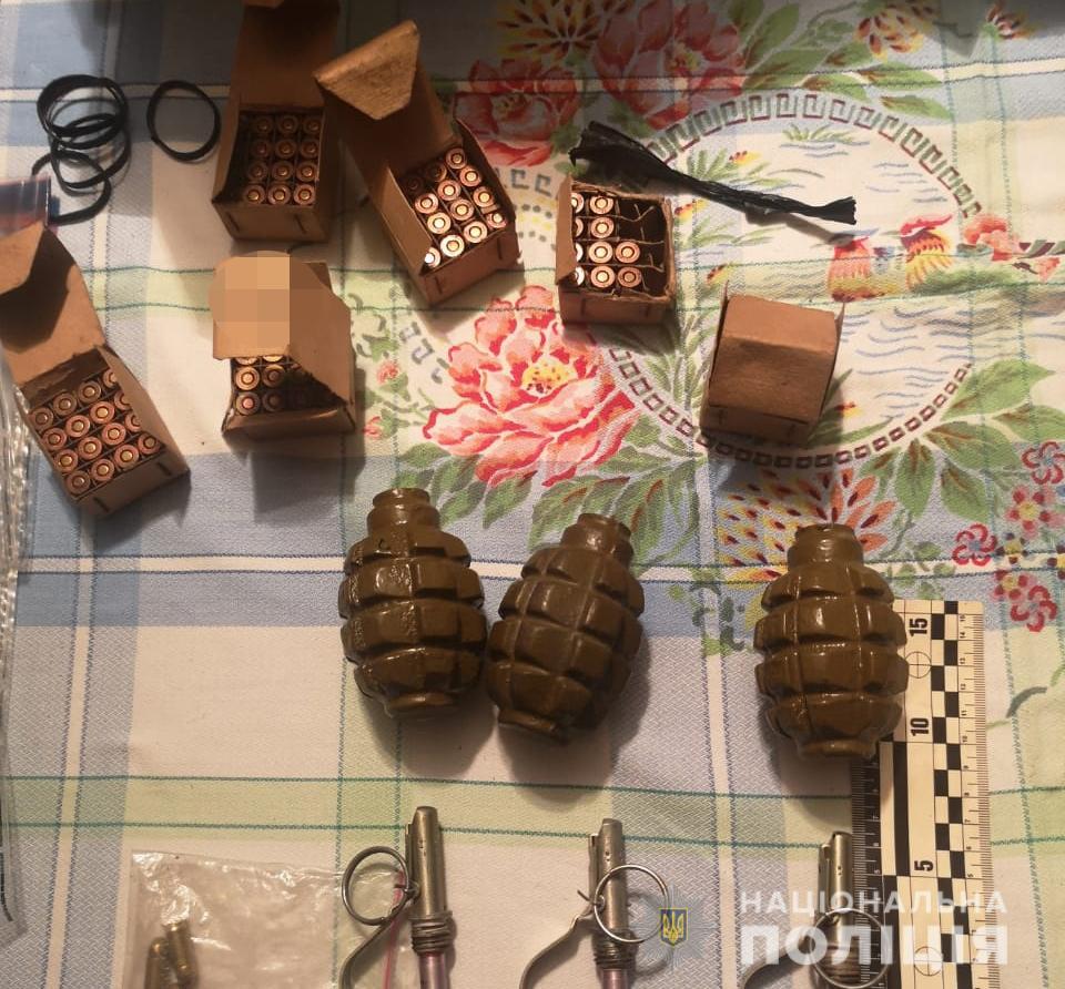 Загалом правоохоронці вилучили два предмети схожі на пістолети, два пристрої для безшумної стрільби, споряджені магазини, майже 300 набоїв різного калібру, три предмети схожі на корпуси гранат Ф-1, три предмети циліндричної форми схожі на запали типу УЗРГМ, металеві предмети схожі на комплектуючі до вогнепальної зброї, вогнепровідний шнур.
