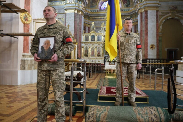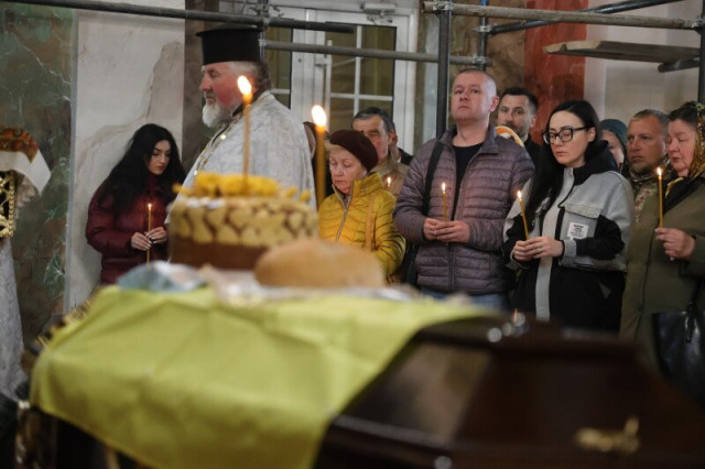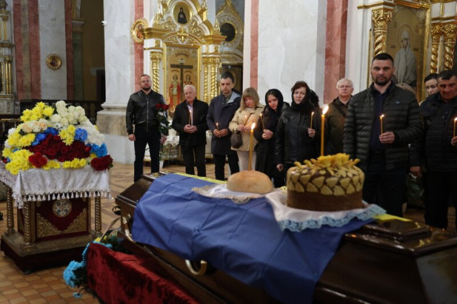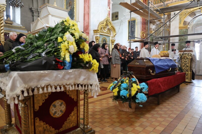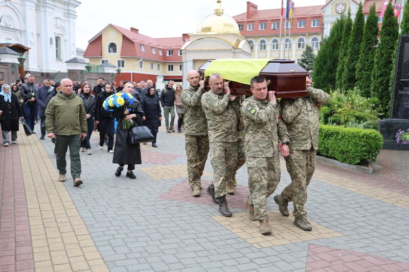 Після завершення богослужіння труну з тілом захисника пронесли Театральним майданом. Біля пам’ятного фотостенда загиблим Героям траурна процесія зупинилася і виконала Державний Гімн.