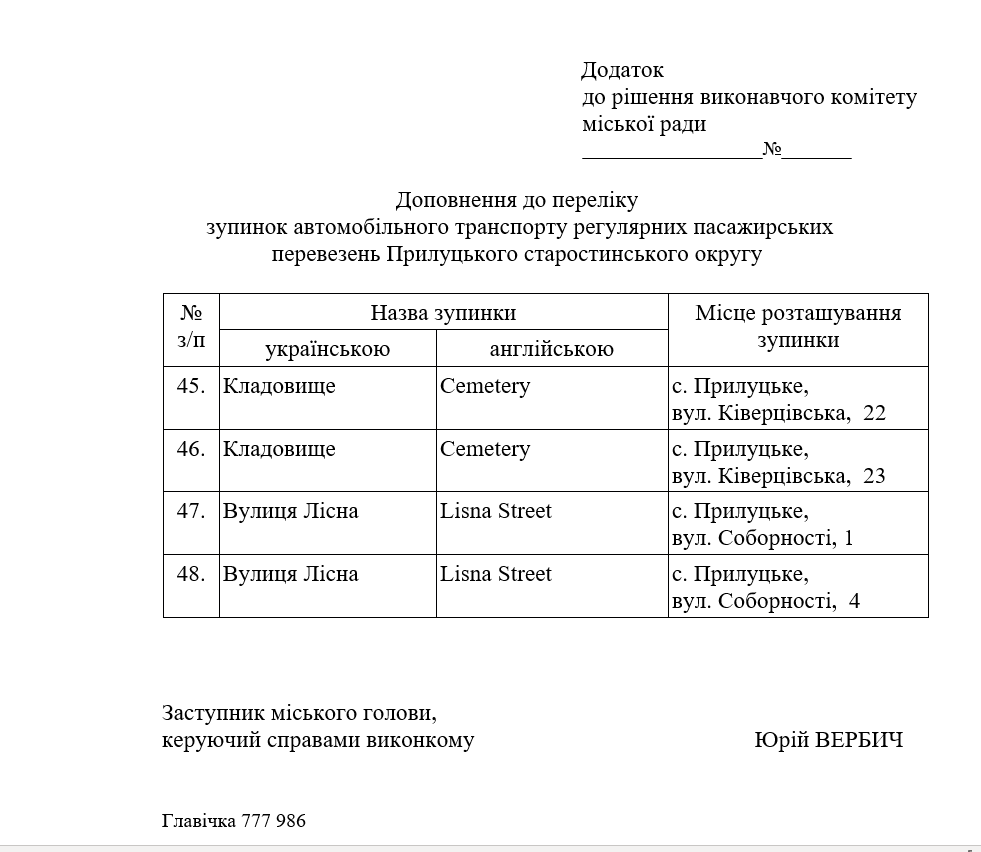 У зв’язку зі зверненнями жителів села Прилуцьке передбачено додатково облаштувати чотири зупинки громадського транспорту в цьому населеному пункті.Окрім цього, через перейменуванням вулиці Тарасова на вулицю Центральну у селі Милуші виникла необхідність у перейменуванні трьох зупинок громадського транспорту та зміні адрес розташування чотирьох зупинок, а також зміні адрес розташування однієї зупинки у селі Княгининок та двох – у селі Великий Омеляник.