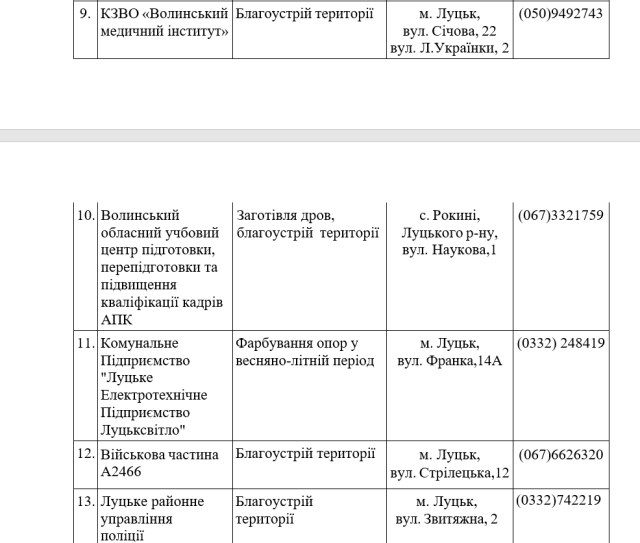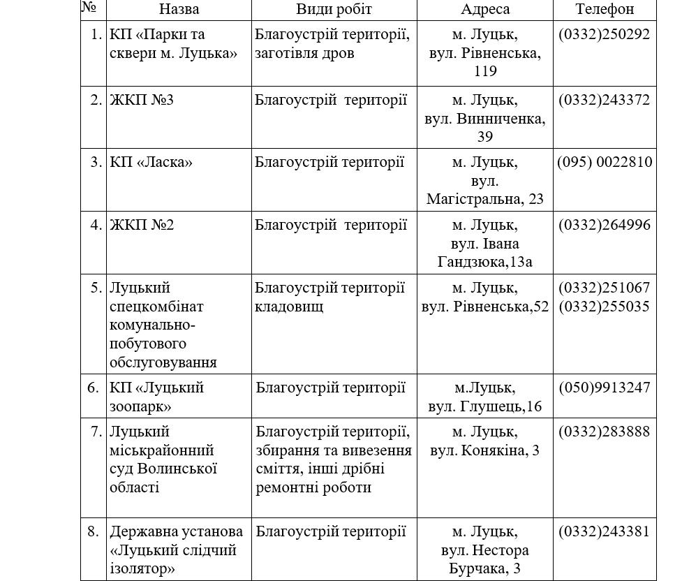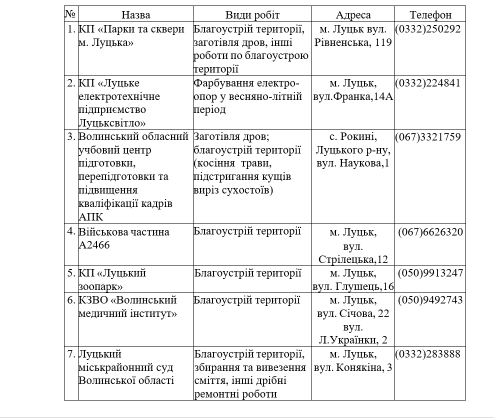 У Луцькій громаді визначили перелік місць, де особи відбуватимуть покарання у виді громадських робіт та виконуватимуть оплачувані роботи у 2025-му році.