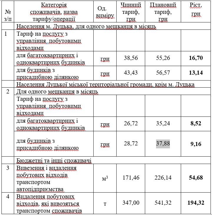 Тарифи на послугу з управління побутовими відходами зростають та становлять для багатоквартирних і одноквартирних будинків у Луцьку – 55,26 грн; для будинків з присадибною ділянкою – 56,57 грн.