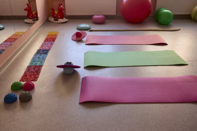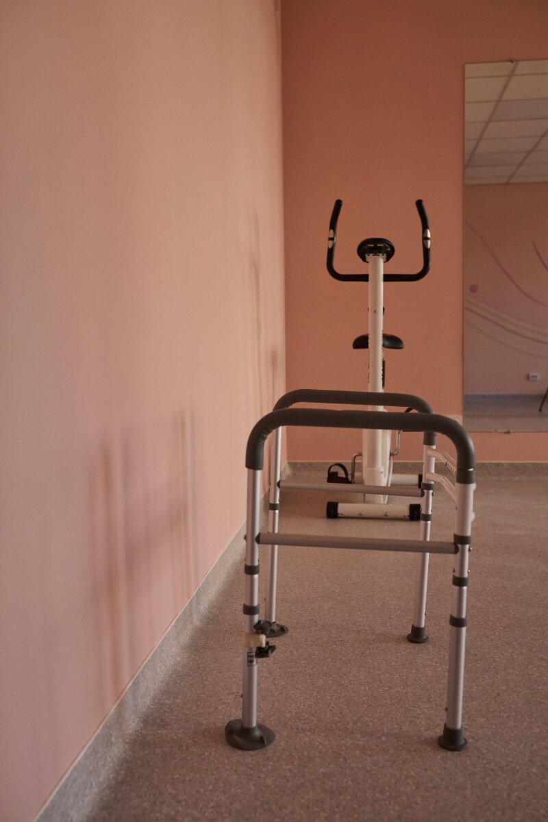 Зал фізичної терапії реабілітаційного відділення дитячої поліклініки — це можливість надавати якісні реабілітаційні послуги дітям у сучасних, комфортних умовах. Просторе приміщення з високою стелею забезпечене гарним освітленням і належною вентиляцією. Великі дзеркала на стінах дають змогу контролювати виконання вправ та візуально розширюють простір.