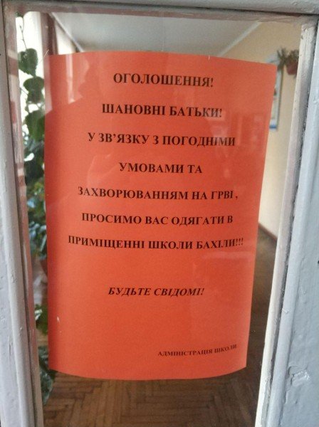 У зв’язку з погодніми умовами та піком захворюваності на грип і ГРВІ адміністрація школи №7 у Луцьку просить батьків одягати в приміщенні бахіли.