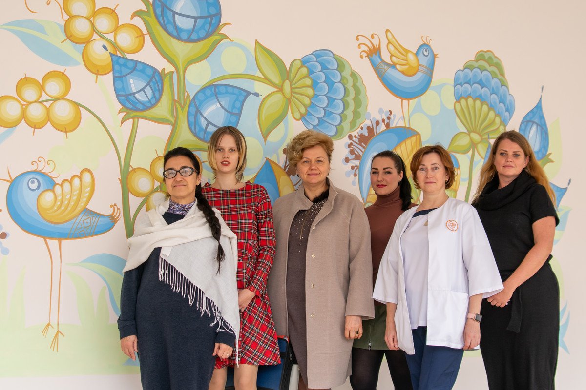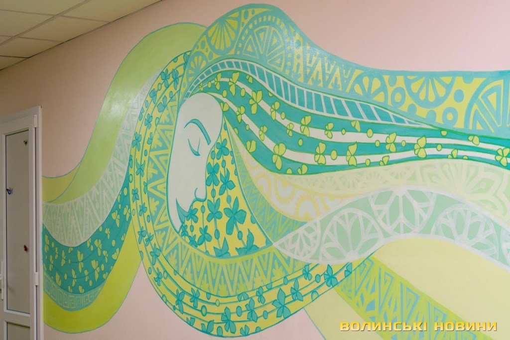 «Ми дуже хотіли, щоб наші роботи створювали затишок, зігрівали, – каже Алла Жупанюк. – Зізнаюся, і колеги мене підтримають, що над цим проєктом нам працювалося напрочуд легко й комфортно. Велику увагу ми приділяли кольорам, адже чітко розуміли, для кого створюємо цю красу. Важливою була й символіка, яку закладали в малюнки. Наприклад, у кімнаті, де відбуваються заняття «Школи відповідального батьківства», головний образ – образ жінки як початку всього живого, на стінах реанімаційного відділення також ми зобразили жінку з довгими косами – символом надії на все добре, до того ж, тут малювали в зелених тонах, бо відомо, що зелений колір не лише заспокоює, це ще й колір надії. Також ми використовували солярні знаки трипільської доби, адже саме в цій культурі дуже шанували жінку. Ну і, звісно, у кожну роботу вкладали часточку своєї душі».