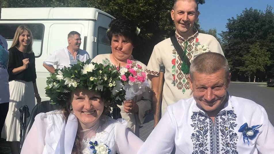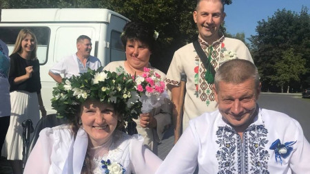 Перша пара молодят – 43-річна Валентина і 52-річний Віктор. Обоє пересуваються на кріслах колісних. Зустрічатися почали в Італії, де через повномасштабну війну провели півтора року.