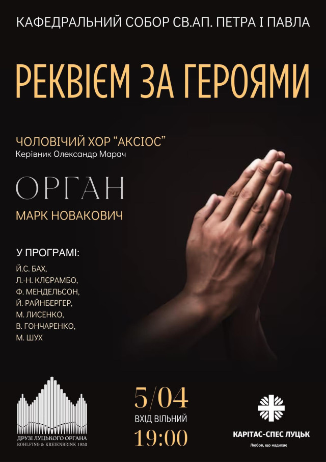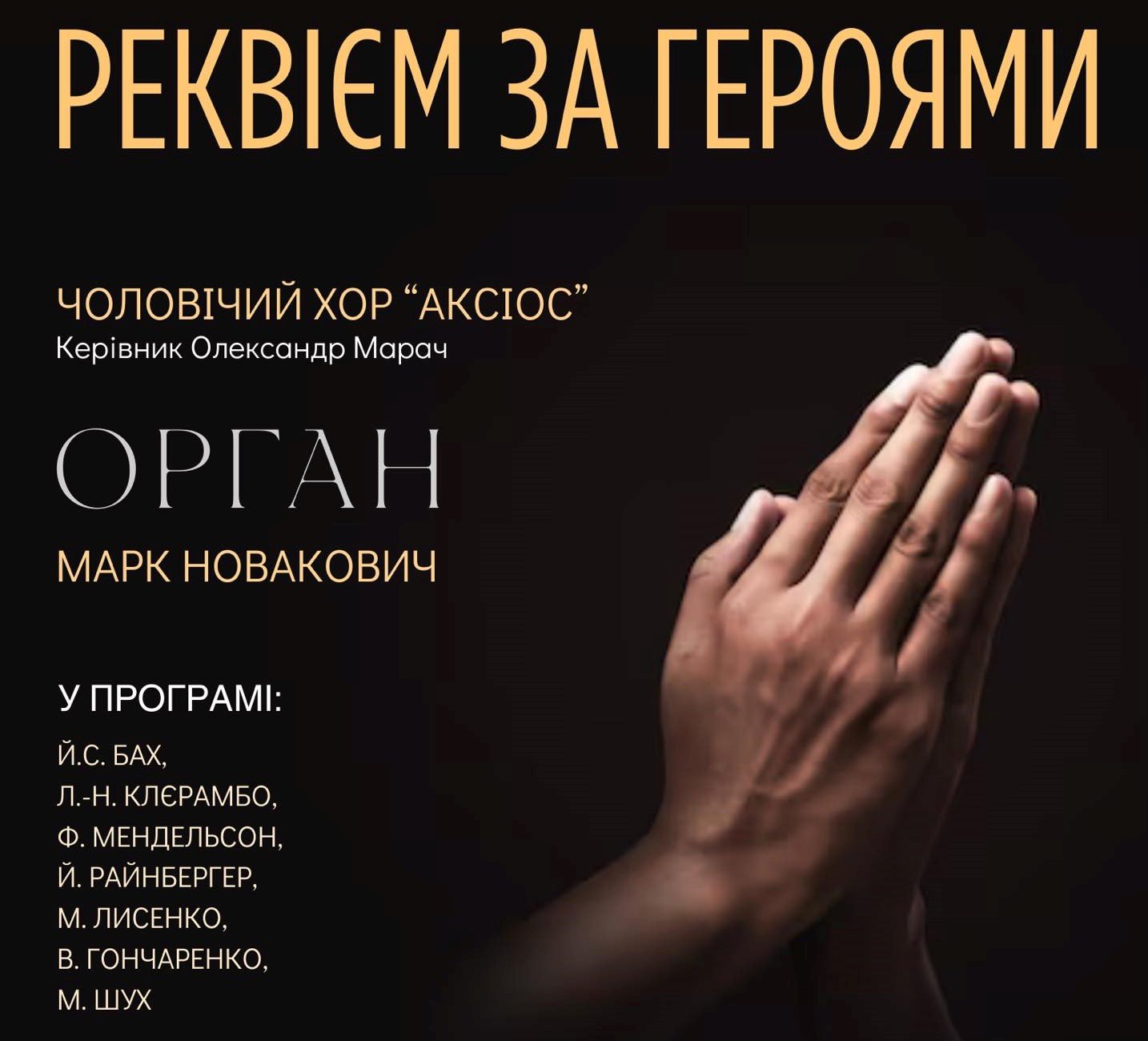 Чоловічий хор «АКСІОС» та органіст Марк Новакович створять атмосферу, де кожна нота – це молитва, а кожен голос – це подяка тим, хто тепер у небесному строю.