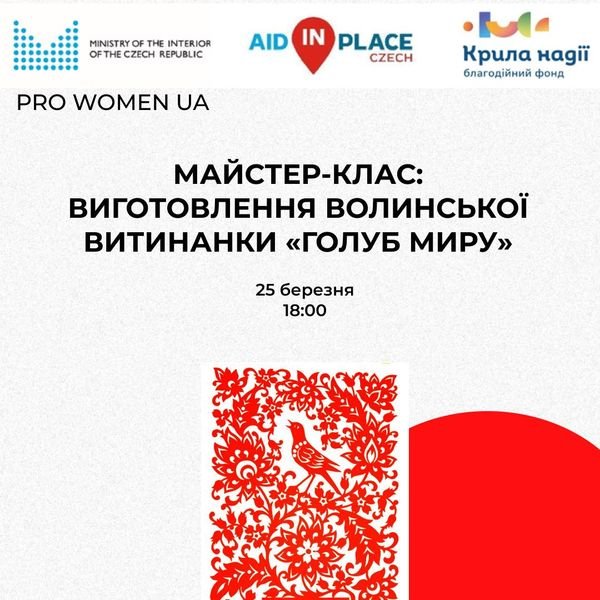 25 березня (початок о 18:00) у Волинському краєзнавчому музеї пройде майстер-клас з виготовлення волинської витинанки «Голуб Миру». Колись люди вірили, що витинанки можуть захищати від зла. Зараз ми віримо, що це оберіг, який символізує єдине бажання всіх українців.