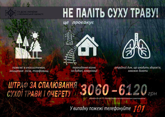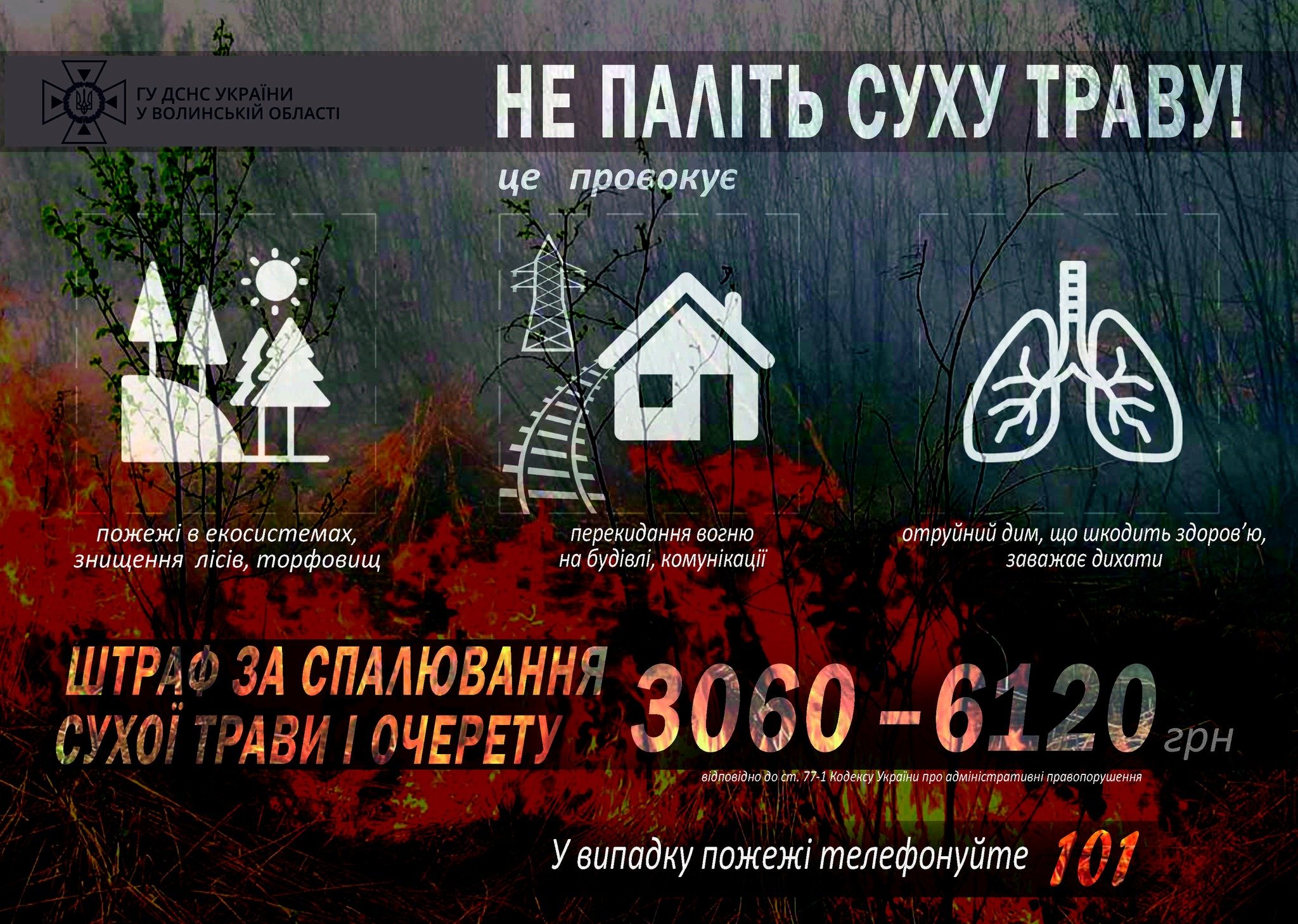 Рятувальники закликають населення не палити суху траву. За це передбачений штраф.Як ми писали раніше, 20 січня рятувальникам надійшло повідомлення про паління сухої трави в селі Струмівка поблизу Луцька. Вогонь загрожував перекинутись на сусідні з палаючою ділянки та господарські будівлі. З’ясувалося, що пожежу спричинив місцевий мешканець.