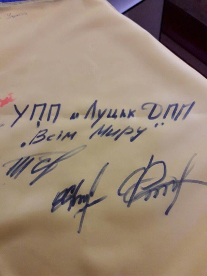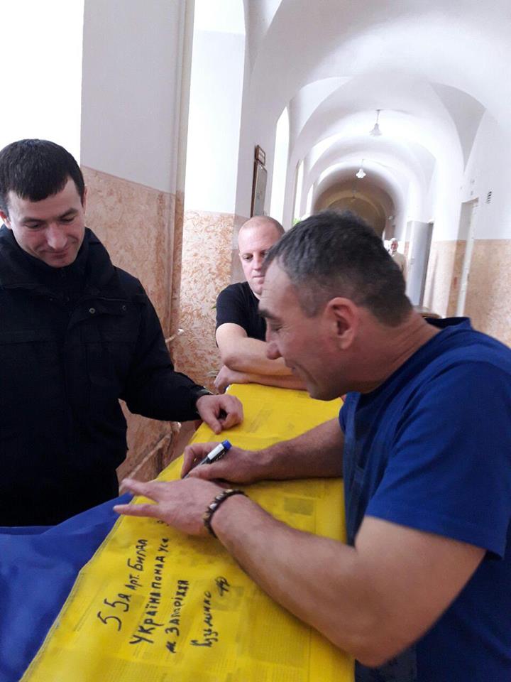 Полісмени принесли з собою подарунки та прапор України, на якому бійці ставили свої підписи і записували місця служби.