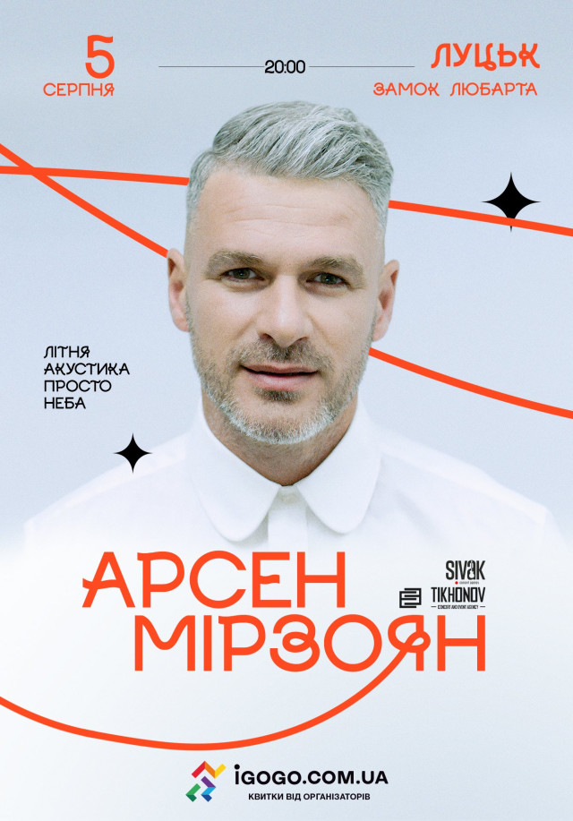 Квитки можна придбати на сайті https://igogo.com.ua/events/ukarsen-mirzoan-akustika-u-luckomu-zamkuruarsen-mirzoan-akustika-u-luckomu-zamku.