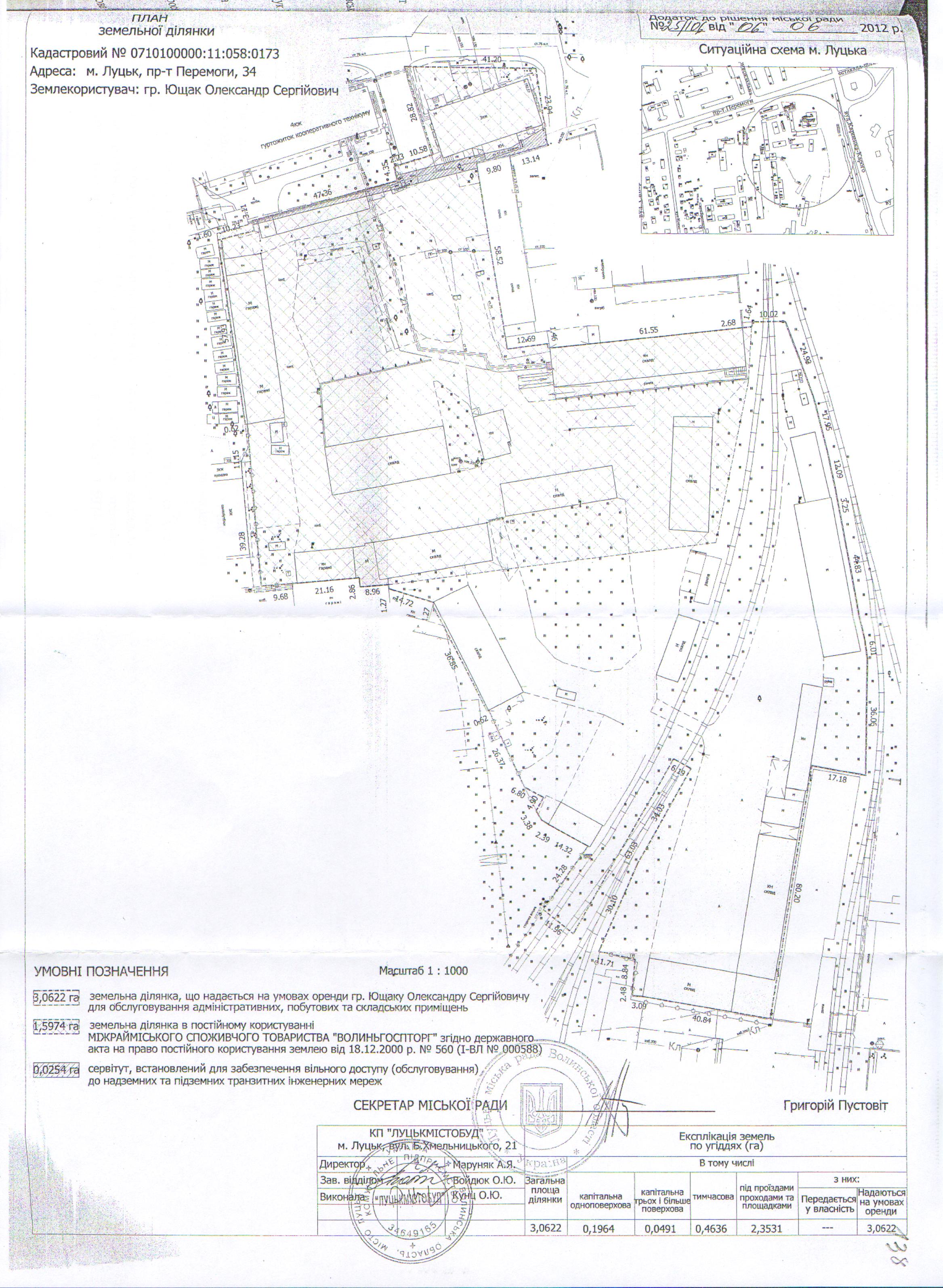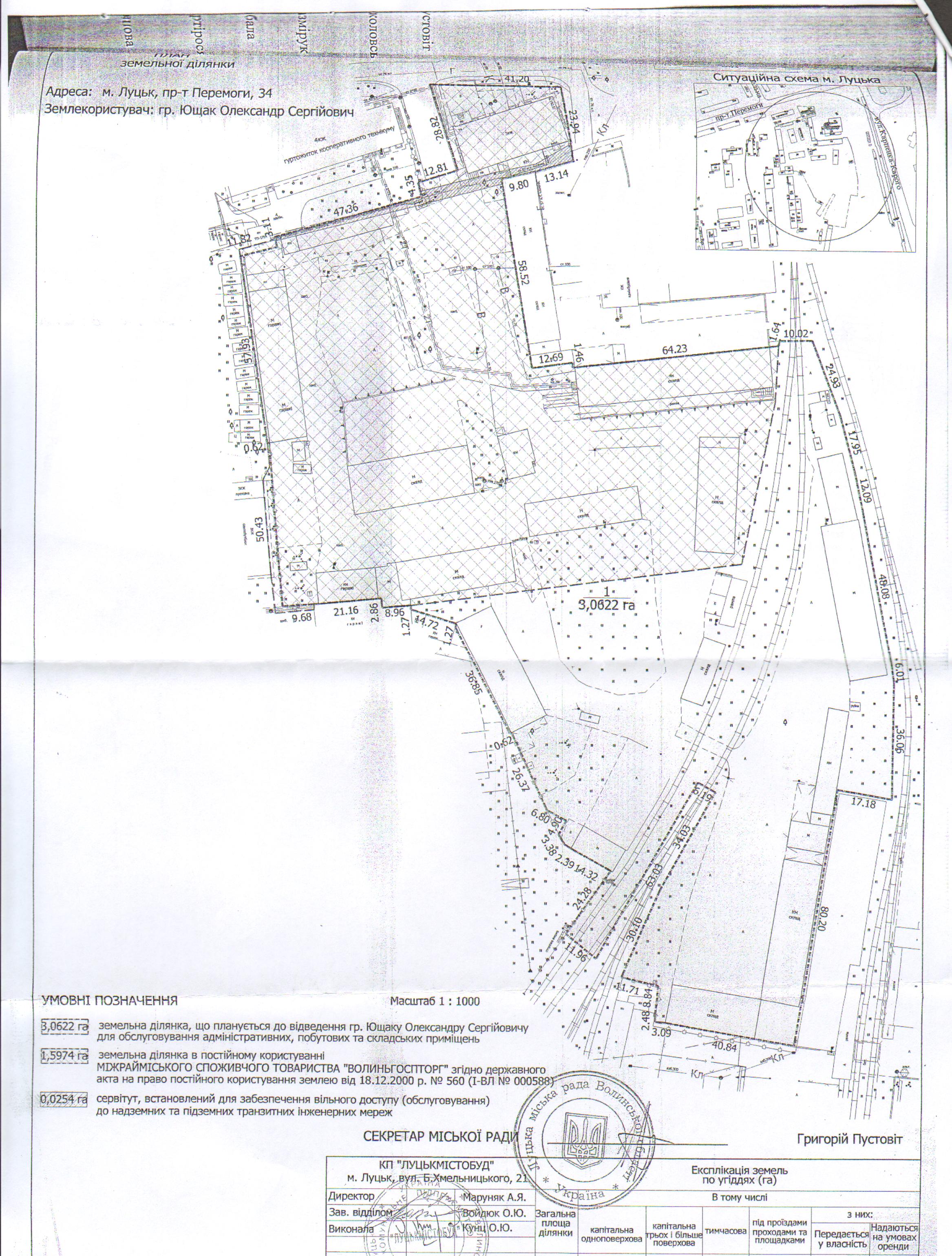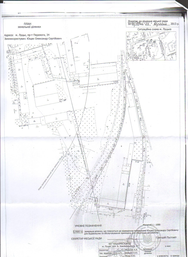 Йшлося про скасування рішення від 28.03.2012 № 22/70 «Про надання громадянину Ющаку О.С. дозволу на розроблення проекту землеустрою щодо відведення земельної ділянки для обслуговування адміністративних, побутових та складських приміщень на пр-ті Перемоги, 34» (ділянка площею 3,0622 гектара), рішення від 26.09.2013 № 45/109 «Про надання громадянину Ющаку О.С. дозволу на розроблення проекту землеустрою щодо відведення земельної ділянки для будівництва та обслуговування приміщень для зберігання автомобілів на пр-ті Перемоги, 34» (ділянка площею 0,7005 гектара).