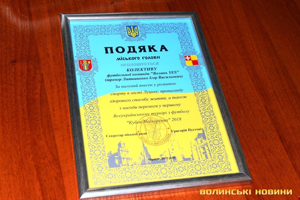 Виконувач повноважень Луцького міського голови Григорій Пустовіт під час відзначення, що відбулося 14 червня у приміщенні міськради, зауважив, що команда виборола чудовий кубок, і дуже важливо, що знову перші місця займають Луцьк і Волинь. Він побажав футболістам, аби дух перемоги залишався з командою, містом та областю. Він наголосив, що хотілося б, аби нашою перемогою по швидше закінчилася війна на сході країни, адже нам не потрібно чужих територій, але ми не поступимося своїми. Колективу футбольної команди «Волинь YES» (тренер Ігор Литвиненко) він оголосив подяку за вагомий внесок у розвиток спорту у Луцьку, пропаганду здорового способу життя та з нагоди перемоги у першому Всеукраїнському турнірі з футболу «Кубок Нескорених» 2018.