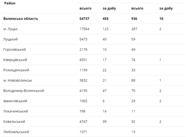 За останню добу на Волині зареєстровано 455 нових підтверджених випадків коронавірусної хвороби COVID-19 (з них дітей – 25, медпрацівників – 12). Одужало за добу – 490 осіб, летальних випадків – 10.