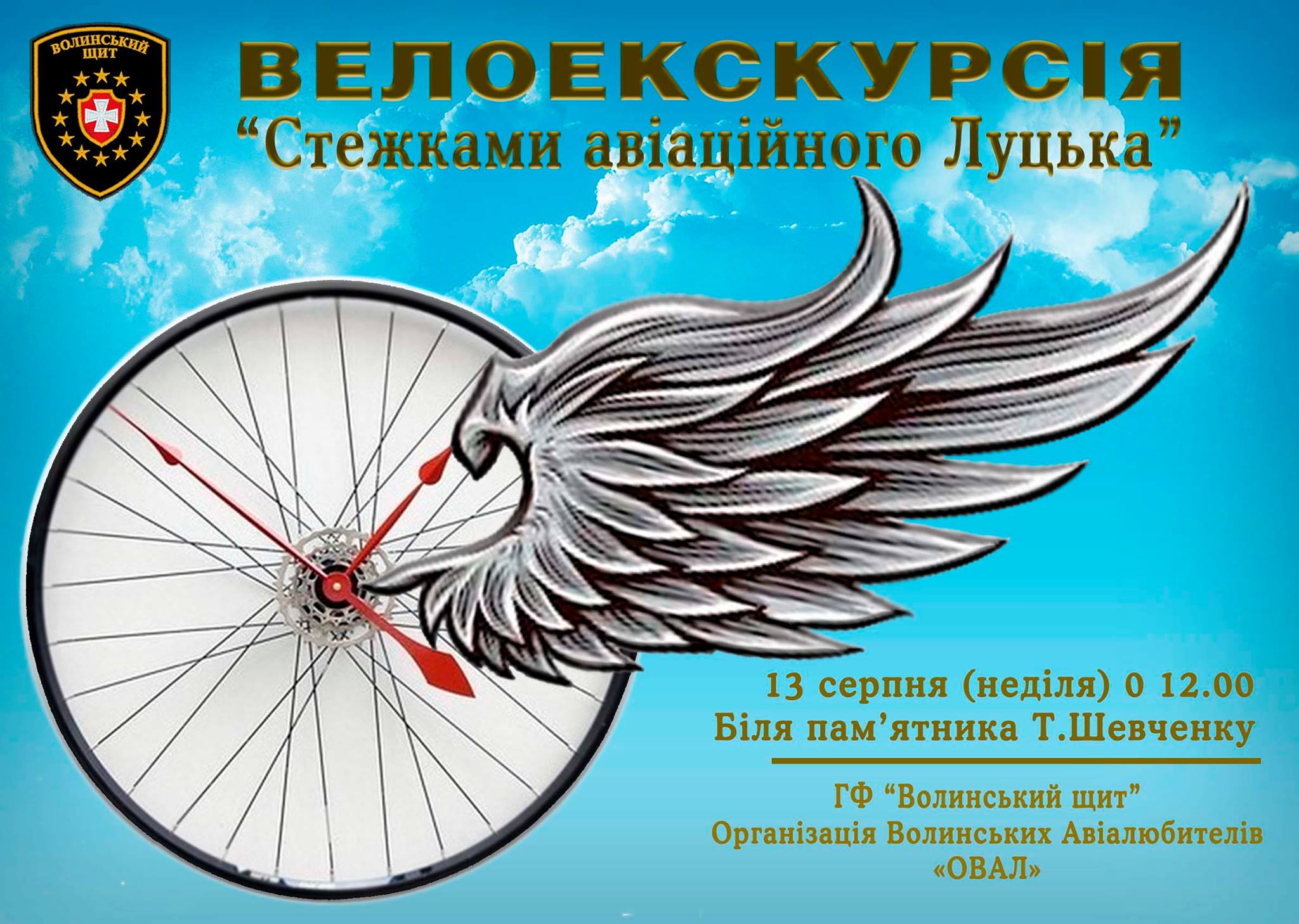В неділю, 13-го серпня, в м. Луцьку буде проведена безкоштовна велосипедна екскурсія "Стежками авіаційного Луцька", під час якої буде проведено об'їзд визначних авіаційних пам'яток міста, пам'ятників видатним авіаторам, їх поховань та інших визначних авіаційних артефактів м. Луцька, авіаційний пласт історії якого нараховує понад 100 років. Організовує екскурсію Організація Волинських Авіалюбителів "ОВАЛ✈" і громадське формування "Волинський Щит".