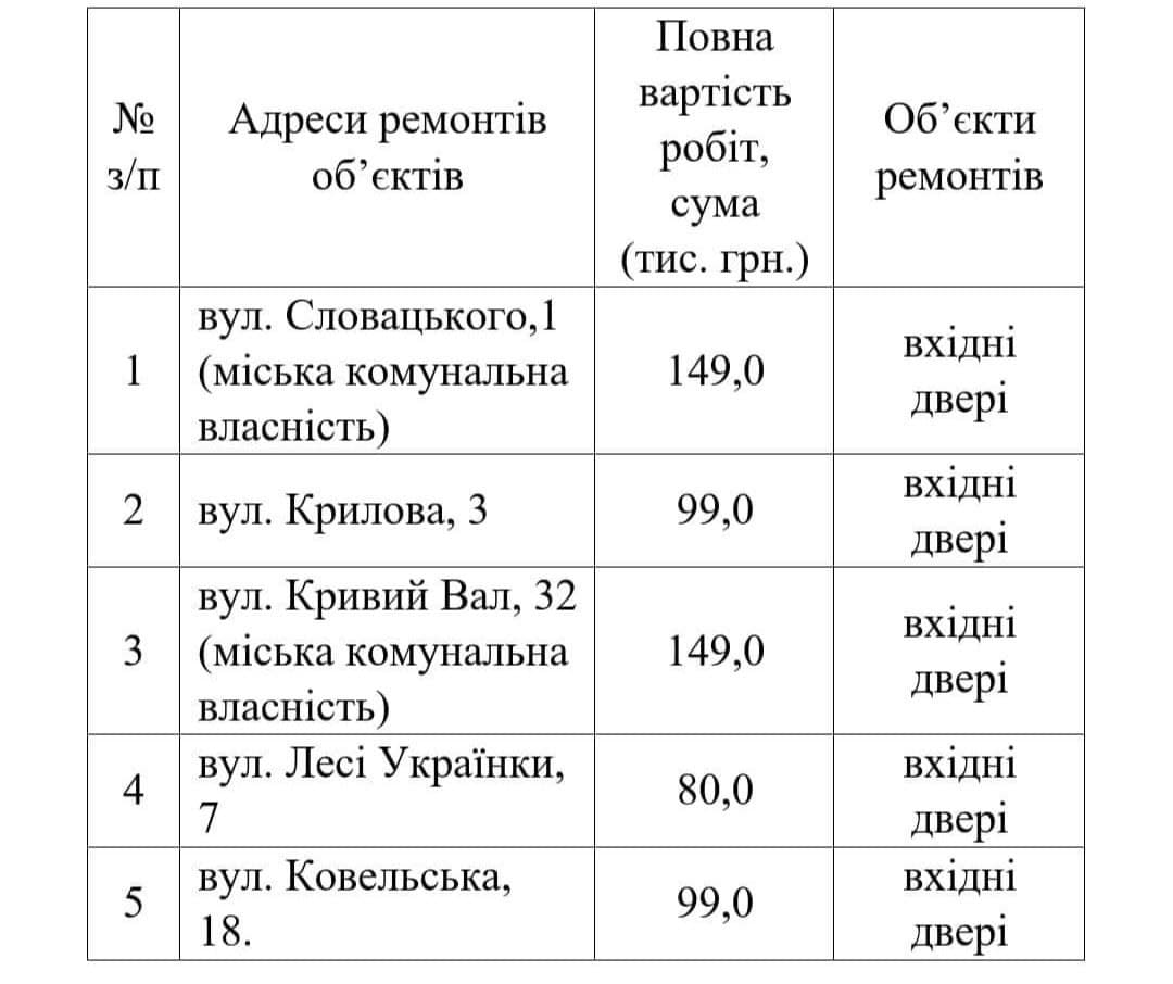 У переліку об’єктів, які планують відреставрувати, – двері в будинках за адресами: Словацького, 1 (будівля Адміністративного суду, повна вартість робіт становить 149 тис. грн); Крилова, 3 (будівля Пенсійного фонду, вартусть робіт 99 тис. грн); Кривий Вал, 32 (149 тис. грн); Лесі Українки, 7 980 тис. грн); Ковельська, 18 (99 тис. грн).Утім, доповідач зазначив, що не можна змусити власників приватних будинків лишати автентичні двері у випадку, якщо їх хочуть викидати або замінити. Тому потрібно вести спеціальний облік таких об’єктів.