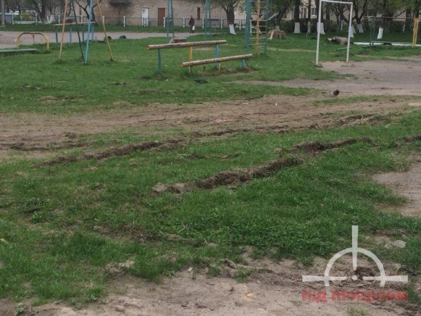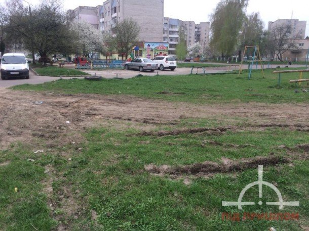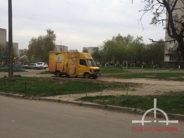 На майданчику була огорожа! Але автобидло спочатку знищило її кусок для заїзду, а коли місце стало розбитим просувається по периметру і нищить далі, шукаючи таку зручну для доїзду травичку а не зроблене ним же місиво.