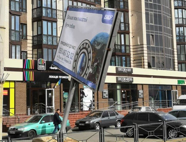 У комунальному підприємстві «Луцькреклама» Першому розповіли, що білборд похилився через ДТП. У четвер, 11 жовтня, у нього в'їхав автомобіль.