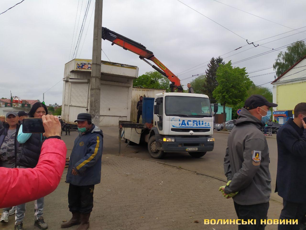 Нагадаємо, на виконання рішення виконкому Луцької міської ради сьогодні розпочали демонтаж 9 кіосків, які не мають права знаходитись в даному місці. МАФи розташовані на двох ділянках, раніше орендованих компанією «Скорпіон-Сервіс», однак у грудні минулого року закінчився термін договору оренди і ділянки було повернуто в комунальну власність.