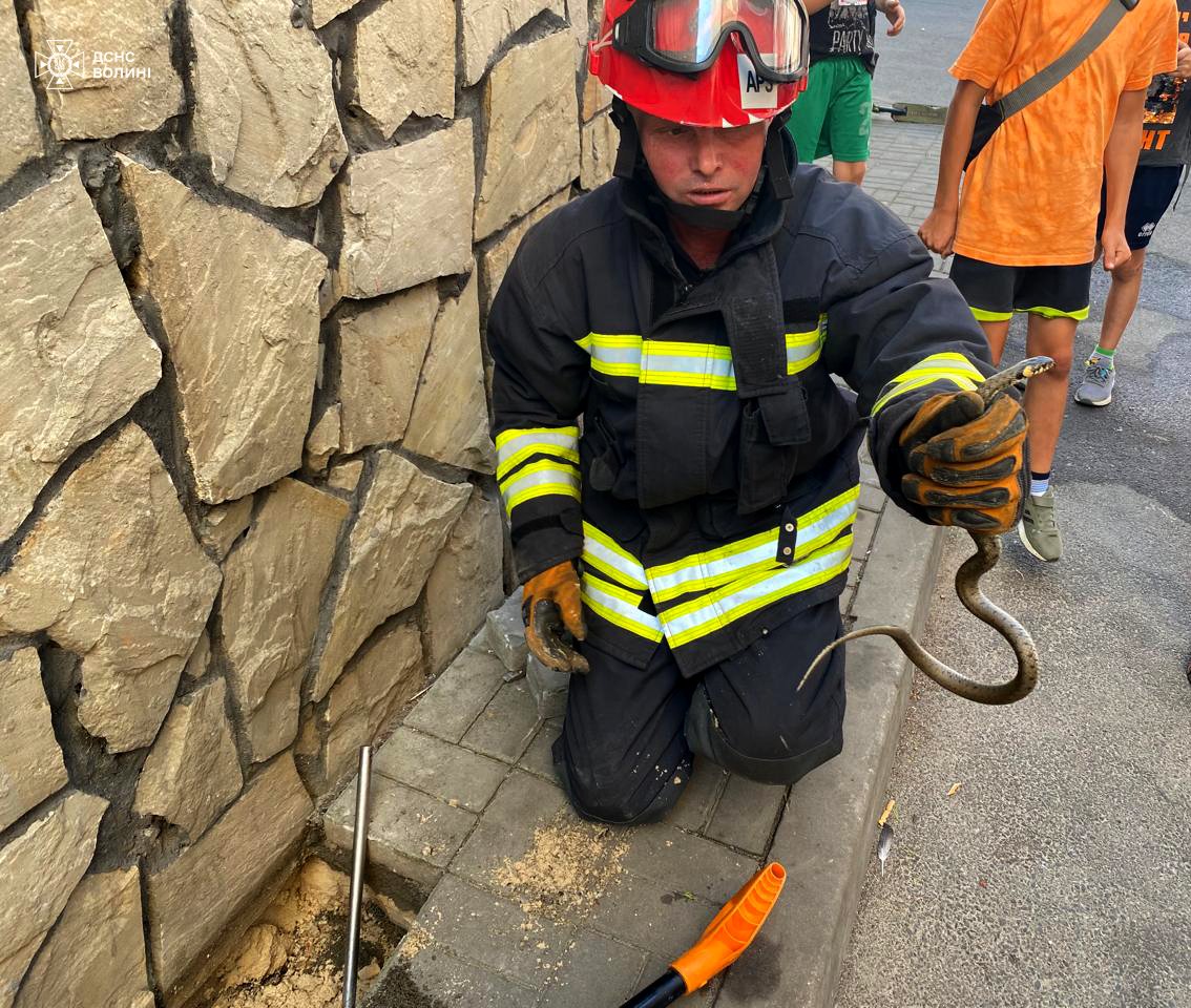 Сьогодні після обіду рятувальники виловили плазуна, що пробрався в щілину між бруківкою і фундаментом багатоквартирного будинку в Луцьку.