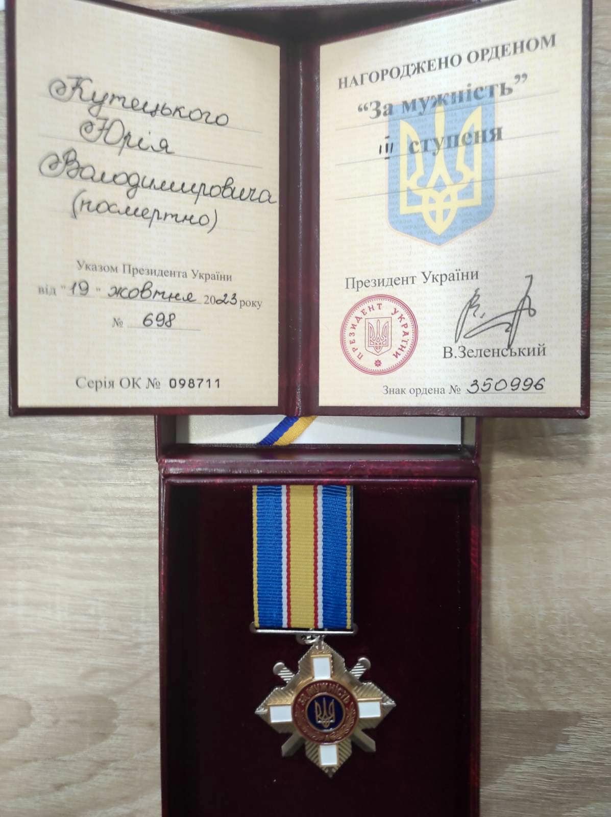Відповідно до Указу Президента України від 19.10.2023 року №698, орденом «За мужність» ІІІ ступеня посмертно нагороджено Юрія Кутецького. Нагороду отримала дружина військовослужбовця Вікторія Кутецька.Відповідно до Наказу Головнокомандувача Збройних Сил України від 13.10.2023 року №2407, почесним нагрудним знаком «Золотий хрест» нагороджено Володимира Шворака. Нагороду отримала дружина військовослужбовця Валентина Шворак.