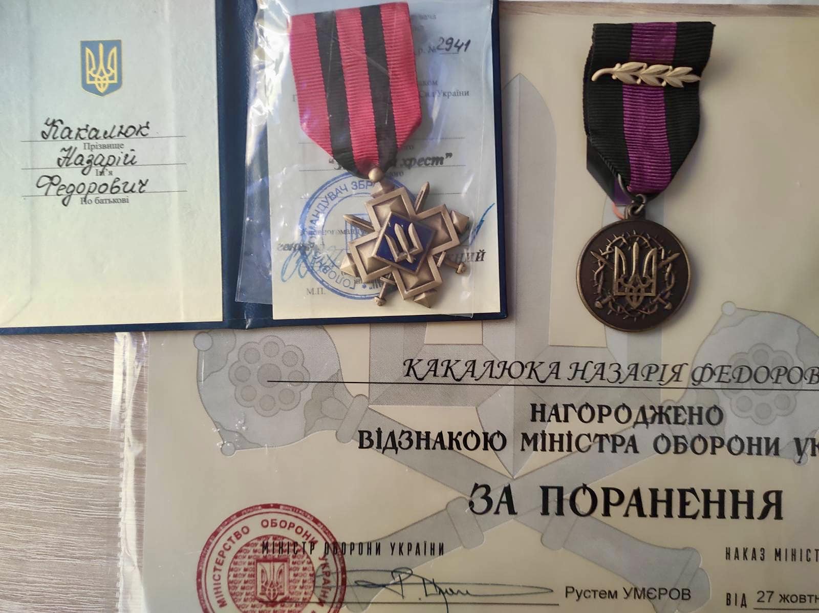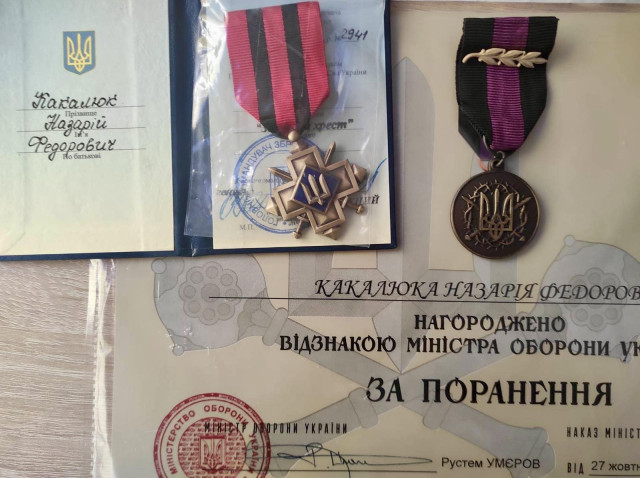 Відповідно до Наказу Міністра оборони України від 27.10.2023 року №340, медаллю «За поранення», а також відповідно до Наказу Головнокомандувача Збройних сил України від 09.12.2023 року №2941, почесним нагрудним знаком «Золотий хрест» нагороджено військовослужбовця Назарія Какалюка.Читати ще: Захисника з Рожища Ореста Власюка нагородили «Золотим хрестом»