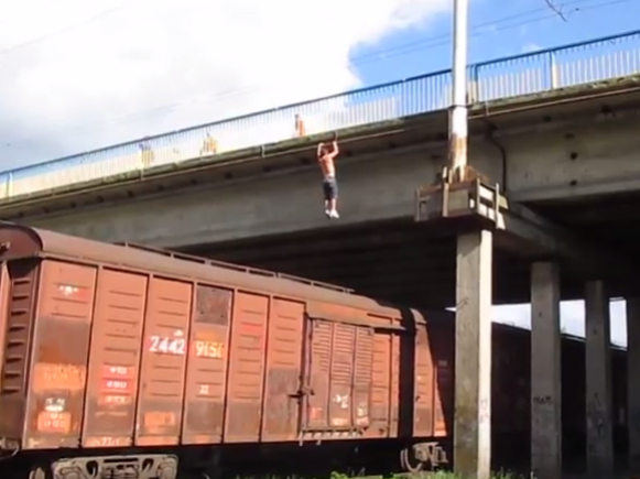 Як видно на відео, чоловік спочатку йде по огорожі шляхопроводу, потім перелазить через огорожу, спускається, тричі підтягується. Тоді здійснює стрибок на вантажний потяг, що стоїть під мостом, і одразу біжить по дахах вагонів довжелезного потяга.