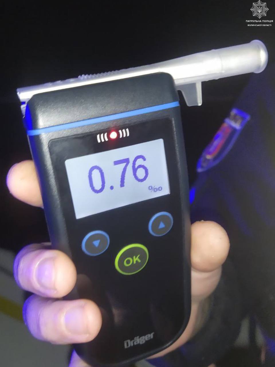 У Ковелі інспектори під час дії комендантської години зупинили авто Volkswagen. В ході спілкування із водієм, поліцейські помітили ознаки алкогольного сп’яніння. Драгер показав 0, 76 проміле.