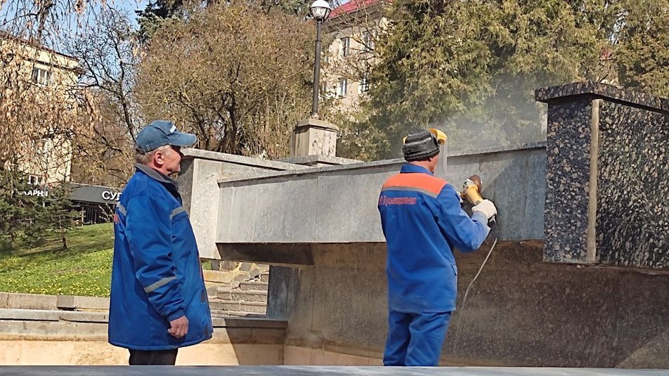 Майстри впорядковуютьсистеми постачання води, фарбують і герметизують шви на фонтанах, а також зчищають наліт із мармурових плит та прибирають всю площу фонтанів.