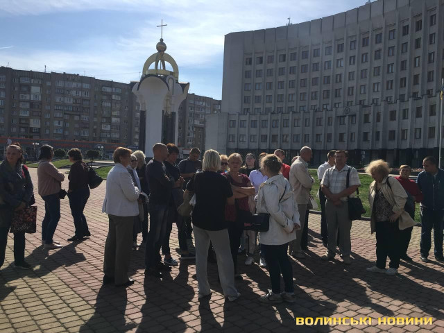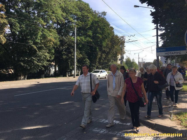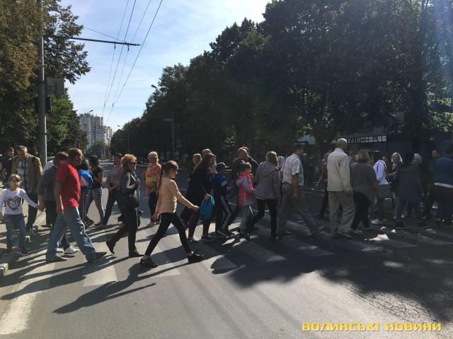 Близько 50 людей рухаються через нерегульований пішохідний перехід на проспекті Волі. Спочатку мітинг зібрався біля обласної ради, очікували, що до них вийде хтось із керівництва, кому вони зможуть висловити свої вимоги. Зауважимо, що представники Волинськії ОДА так і не вийшли до людей.