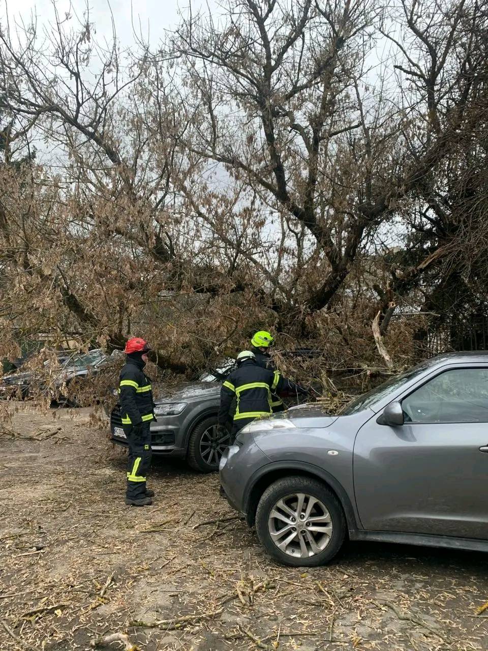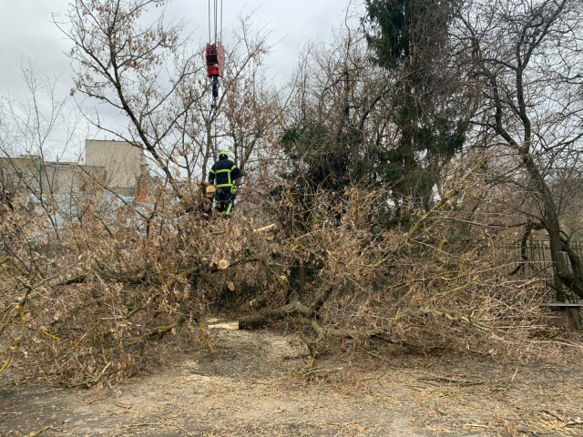 За допомогою крана рятувальники припідняли повалене дерево, відбуксирували транспортний засіб на безпечну відстань, а тоді за допомогою бензопили розрізали стовбур і гілляччя.