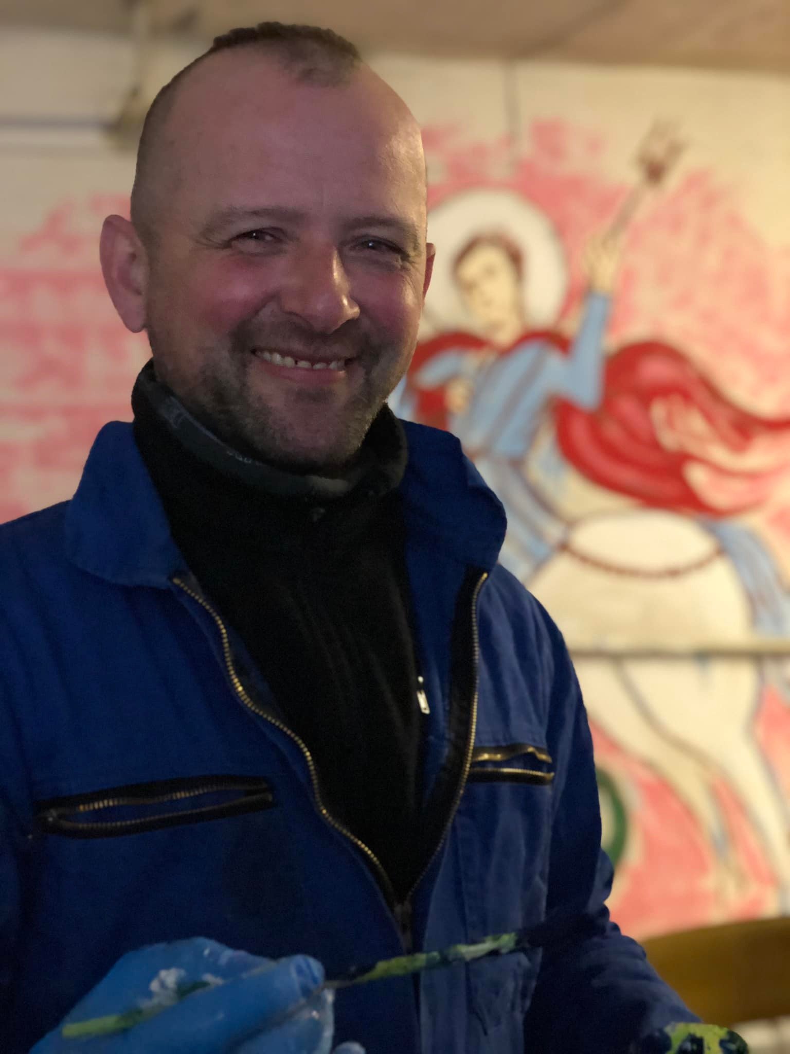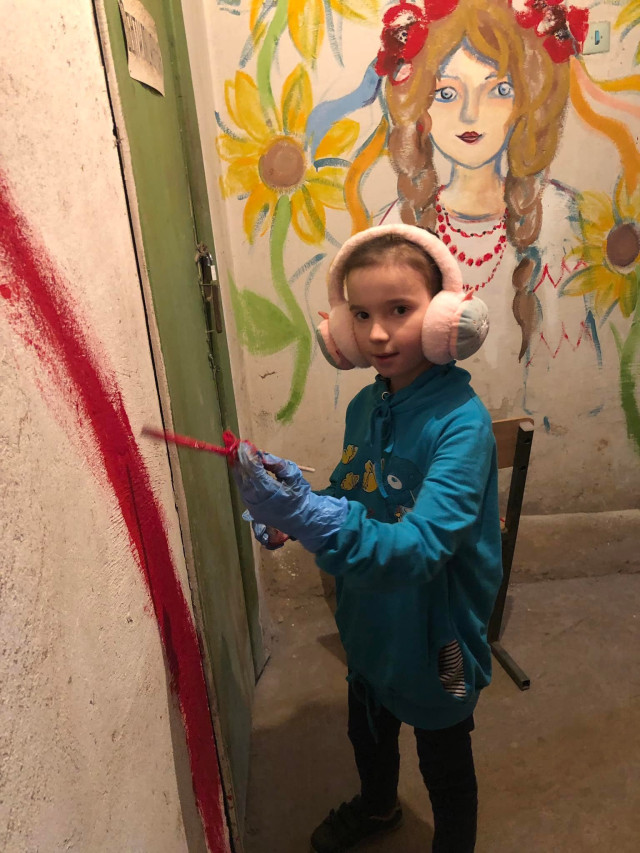 Не лише під час повітряної тривоги, а й в інший час в приміщенні перебувають діти Миколи. Один із синів, 7-річний Михайло, теж долучився до акції, щоб розмалювати на стіні сузір’я. Для зірок, говорить, буде брати зелену, жовту і фіолетову фарби.Комендант Микола з дітьми