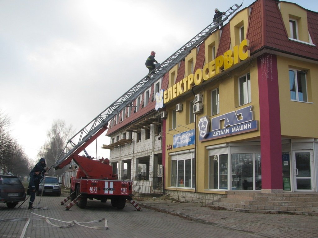 В ході розвідки з’ясувалося, що на горищі будівлі горить мінеральна вата. Відтак зсередини приміщення рятувальники вилучили тліючий утеплювач та подали воду на його гасіння спеціальними пожежними стволами. Зі сторони фасаду будівлі встановили пожежну автодрабину, за допомоги якої рятувальники дісталися покрівлі, демонтували її на незначній площі, щоб провести завершальні роботи з ліквідації надзвичайної події.