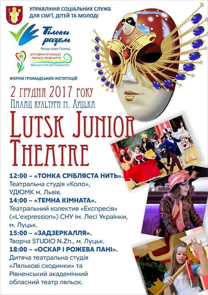 Форум громадських інституцій в рамках культурного проекту «Lutsk Junior theatre» розпочався в Луцьку. Творчі дитячі колективи з Луцька, Львова та Рівного представлять чотири вистави на соціально-побутову тематику, не оминули учасники й теми війни.