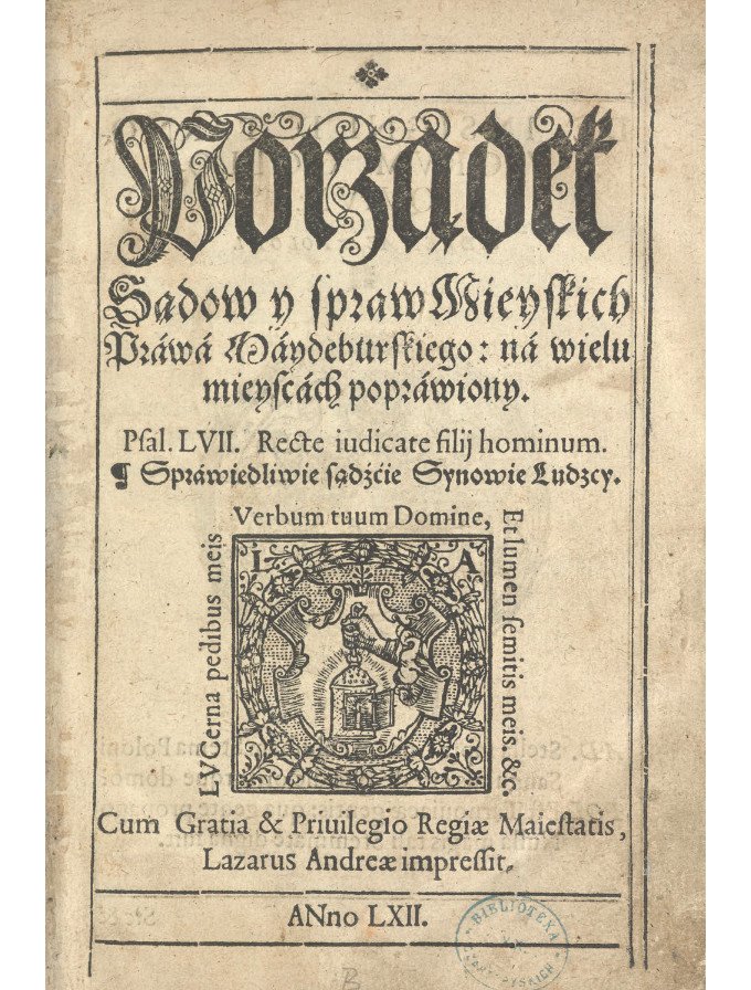 Збірник Porządek sądów i spraw miejskich prawa majdeburskiego w Koronie Polskiej видав Бартоломій Ґроїцький. Він був перекладачем норм маґдебурзького права з латини на польську мову. У книзі зазначалося, що «в ратуші принаймні раз на тиждень, або скільки в тому буде потреба, мають збиратися бурмистр і радники, аби дбати про посполите добро, примножуючи його, а шкодам, які б тому загрожувати могли, перешкоджали».Титульна сторінка книги Бартоломія Ґроїцького