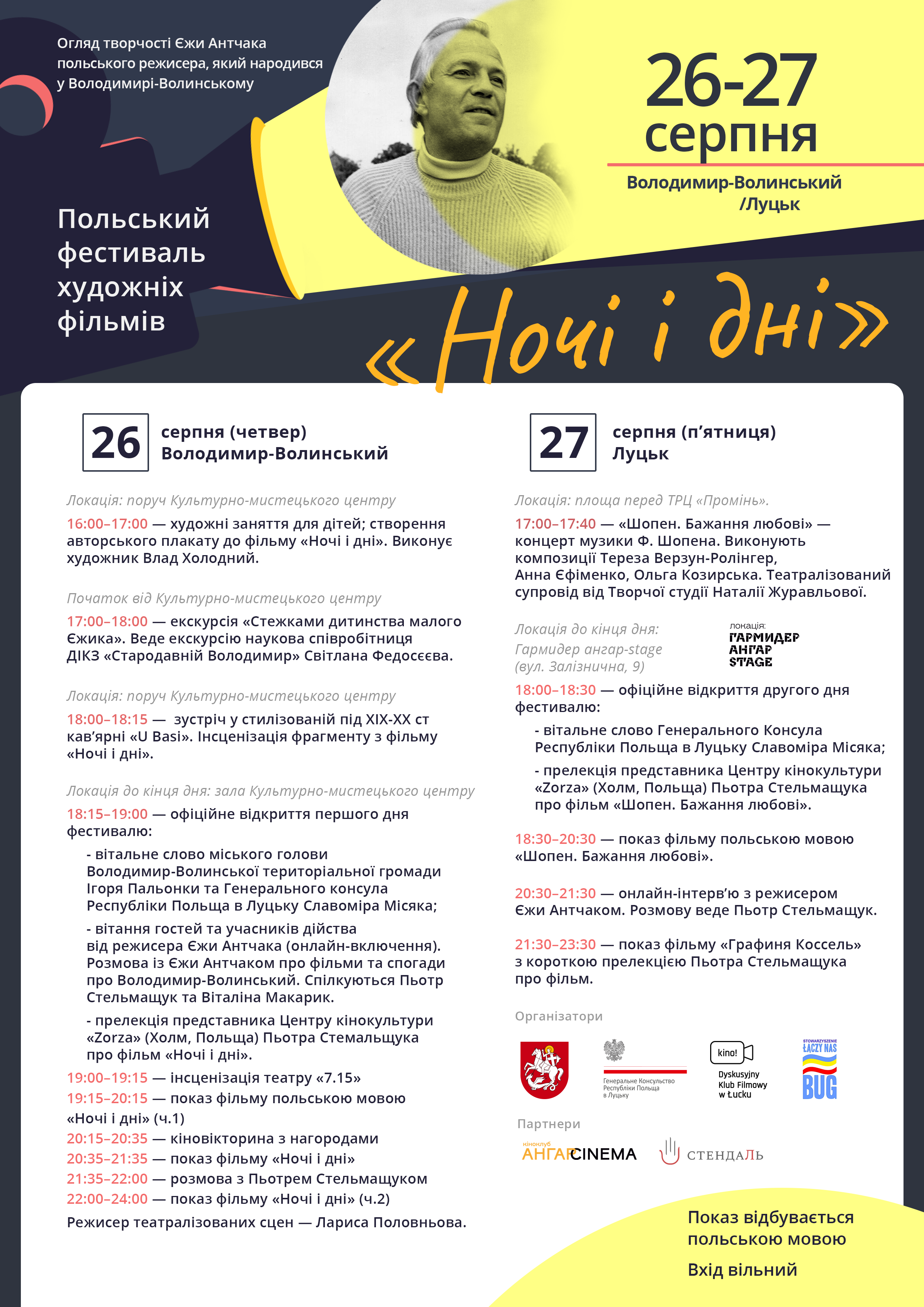 Організовують дійство Генеральне консульство Республіки Польща в Луцьку, Володимир-Волинська міська територіальна громада, «Дискусійний кіноклуб «Плеограф», Товариство транскордонної інтеграції «Єднає нас Буг». Партнери – кіноклуб AngarCinema та ГО «Мистецьке об’єднання «Стендаль».