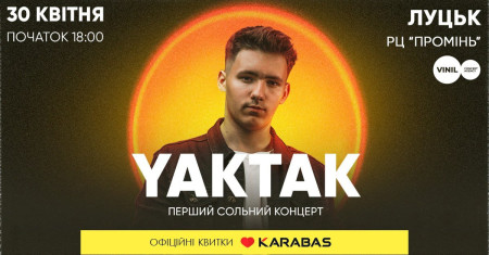 Його голос закохує з перших нот, а пісні залишаються в серці вже після першого прослуховування. 30 квітня у Луцьку в РЦ «Промінь» із першим великим сольним концертом виступить талановий та харизматичний YAKTAK.