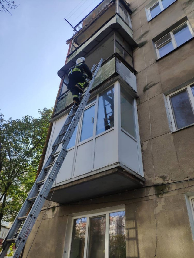Рятувальники встановили висувну драбину і по ній піднялись на балкон квартири. Як виявилось, жінка не могла відкрити двері через травму, отриману при падінні.