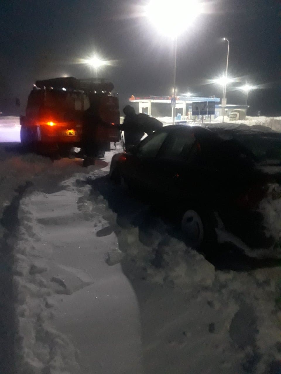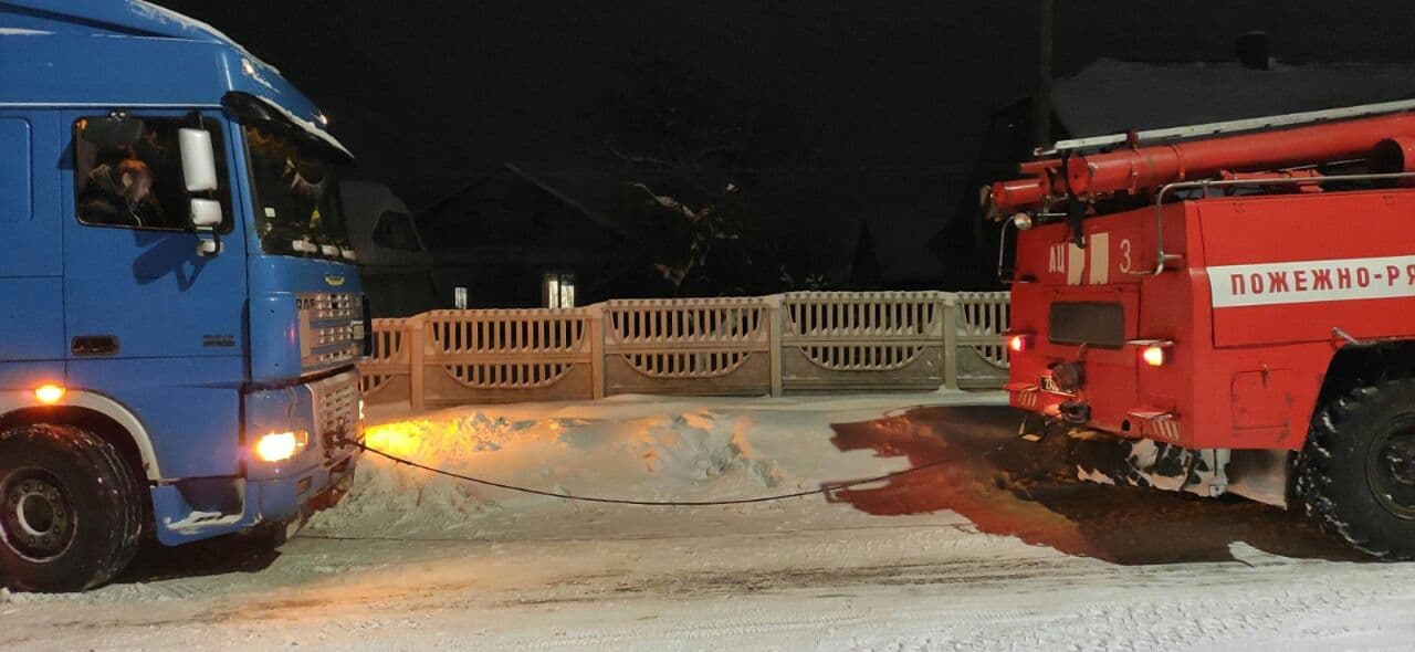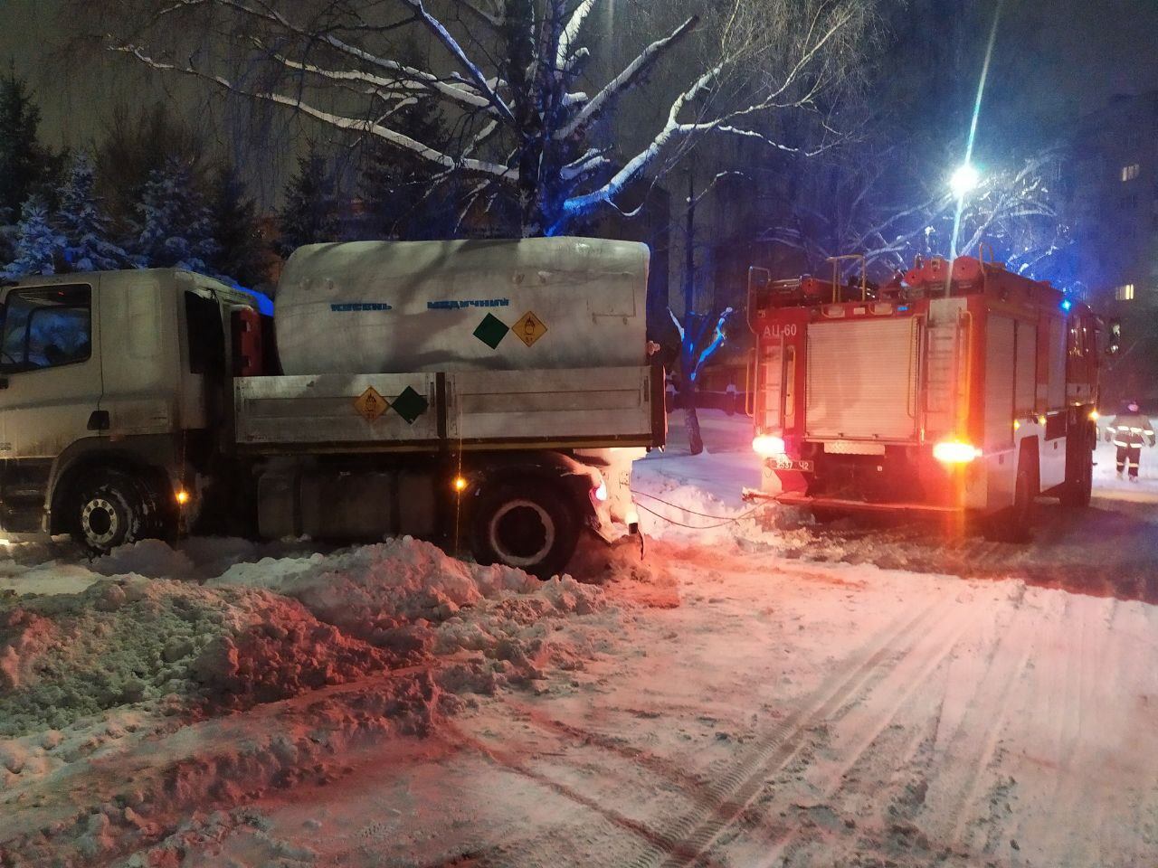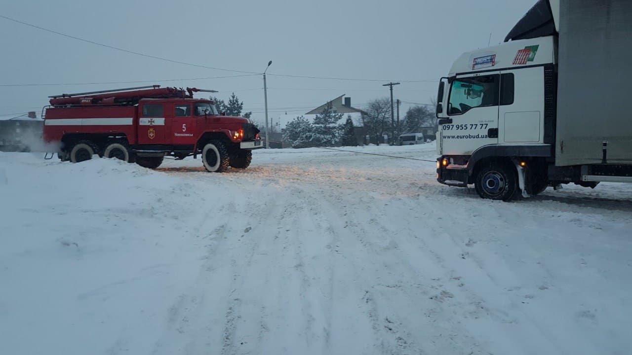 На вулиці Гулака-Артемовського працівники 25-ої Державної пожежно-рятувальної частини відбуксирували вантажний автомобіль, що транспортував резервуар з киснем для пологового будинку й опинився у сніговому заметі.
