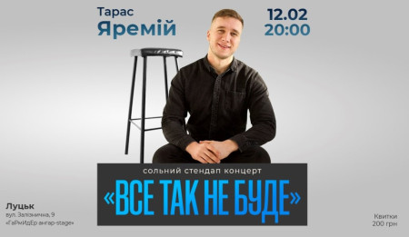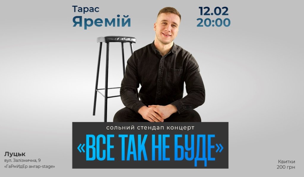 12 лютого о 20:00 в «ГаРмИдЕр ангар-stage» у рамках туру «Все так не буде» відбудеться сольний стендап концерт Тараса Яремія.