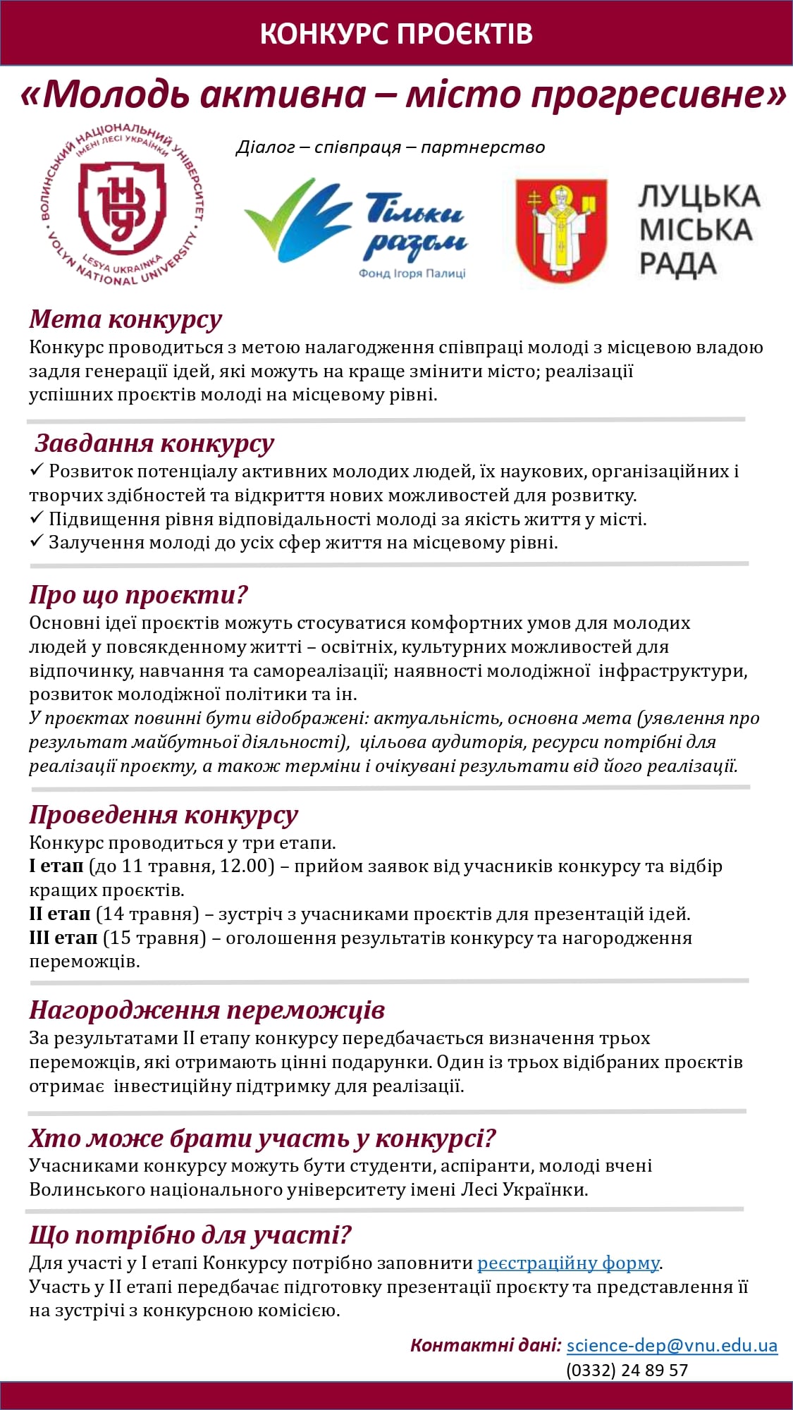 Луцька міська рада, Волинський національний університет імені Лесі Українки та Фонд Ігоря Палиці «Тільки разом» оголошують конкурс проєктів «Молодь активна – місто прогресивне».