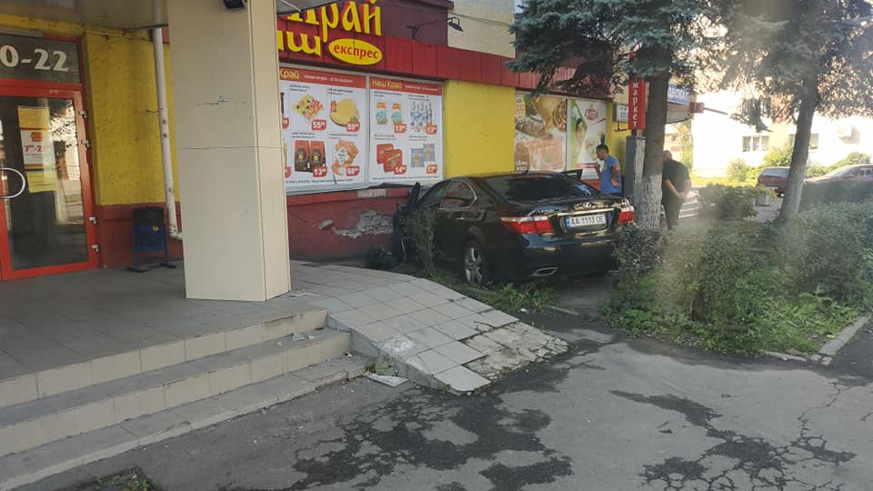 "12.08.18 Лексус на укробляхах влетів в магазин Наш Край на пр.Перемоги 14. Удар був такої сили, що вітрини повалило. Водія і досі шукають", - йдеться у дописі.